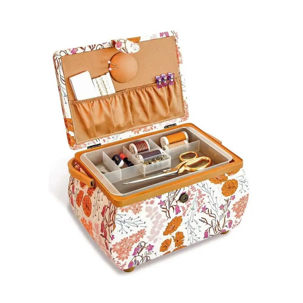 Větší obdélníková kazeta na skladování a transport šicích potřeb. Plastová vložka se 7 oddíly, madlo, praktické zapínání na magnet, jehelníček a 2 látkové kapsy na vnitřní straně víka.