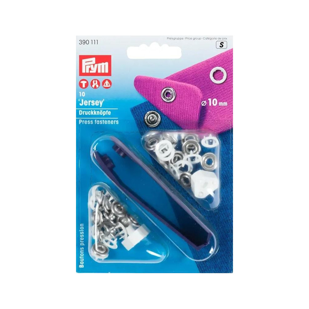 Stiskací knoflíky JERSEY 10 mm, 10 ks na kartě, nikl, s návodem a příslušenstvím.