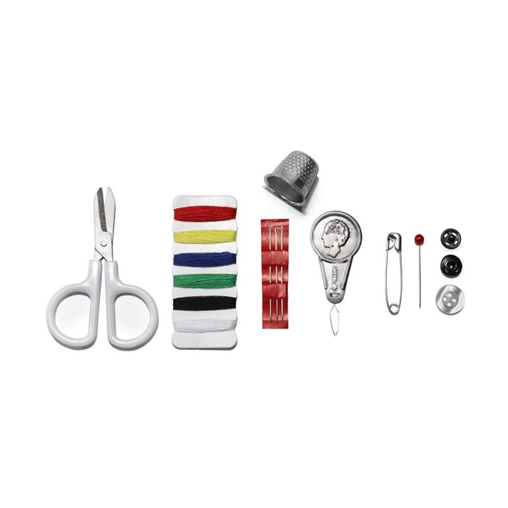 Handy small travel sewing kit, size 7,5x7,5x3 cm. Contains 6 buttons, 6 spools of thread in different colours, 1 needle threader,1 thimble, 3 hand sewing needles, 6 safety pins, 20 dressmaking pins, 3 sew-on snap fasteners and a pair of scissors with plastic handles.