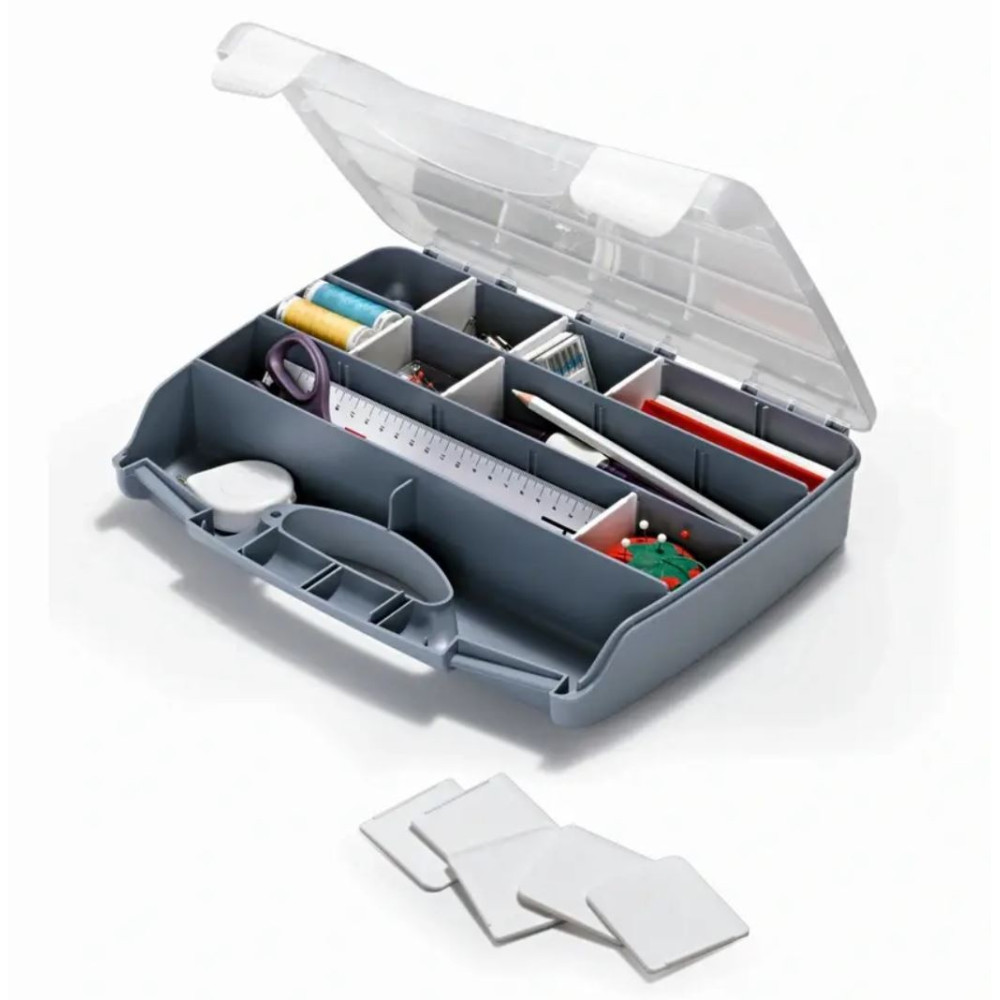 Plastic assortment box for sewing, hadicraft and hobby utensils. Variable partitioning by means of removable partitions. Dim. 316x260x60 mm. Without contents.