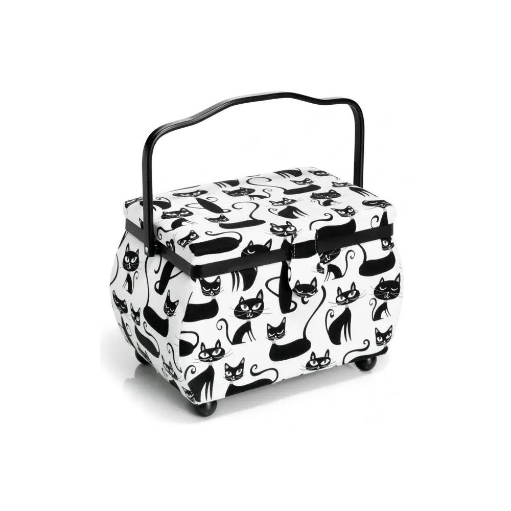Small rectangular sewing basket for storing and transporting sewing accessories. A removable transparent plastic insert with 4 compartments, a carry handle, practical magnetic lock, pincushion and a fabric pocket inside the lid. Dimensions 30x20,5x19 cm.