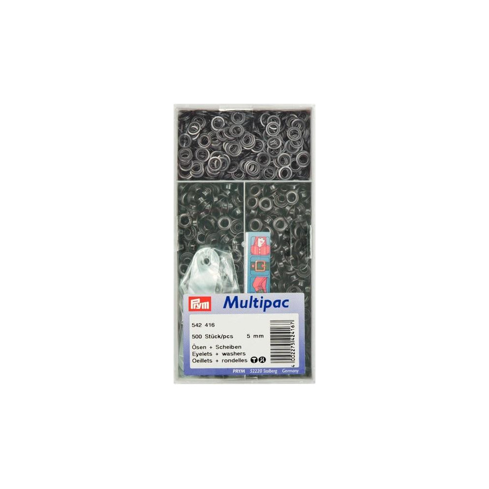 Prym brass eyelets 5 mm in black oxide finish with washers, 500 pcs per pack. Perfect for textiles, leather, and other materials.