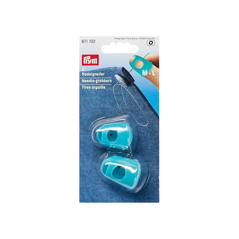 The Prym Silicone Needle Grabber, shaped like a thimble, is an essential tool for hand sewing, especially when pulling needles through multiple layers of fabric or sturdy materials. Made from silicone, it ensures a firm grip on the needle and protects fingers from injury. The grabber features ventilation slots on the underside and a front opening accommodating longer fingernails, ensuring comfortable wear. Each pack contains two grabbers in sizes M (14 mm) and L (19 mm), suitable for the thumb and index or middle finger. Available in turquoise or pink.